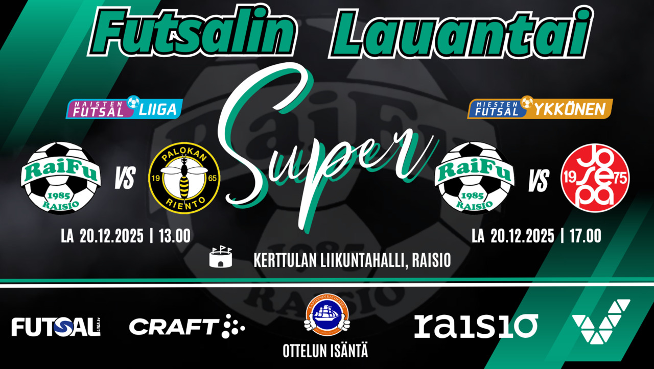 FUTSALIN SUPER LAUANTAI – KOKO SEURA PARKETILLA! Tänään eletään todellista futsaljuhlapäivää, kun RaiFu pelaa kolme virallista ottelua saman päivän aikana. Hallilla nähdään naisten, miesten ja tyttöjen huippufutsalia – aamupäivästä iltaan …